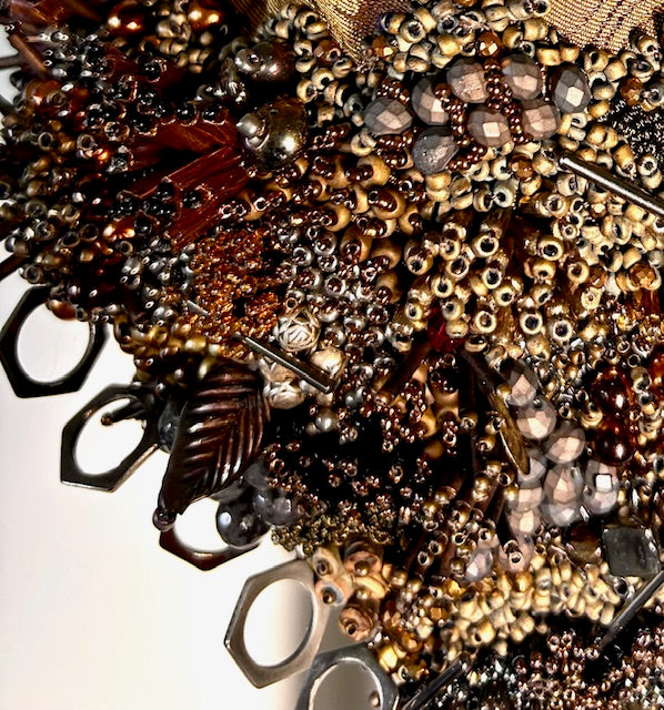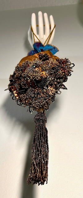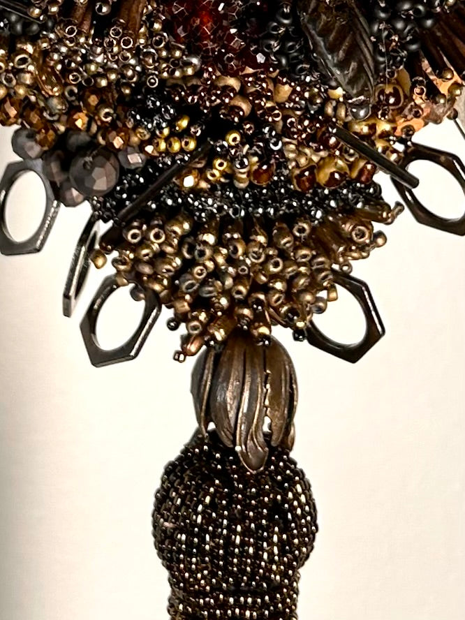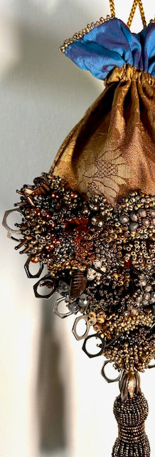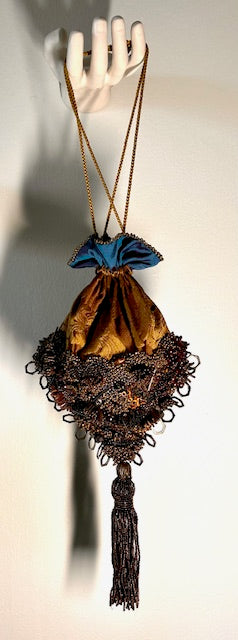 A moody, opulent reticule inspired by the gaslit cobblestone streets of old Edinburgh. Deep bronze brocade damask shimmers like whisky in candlelight, gathered with gold cords that whisper of quiet luxury. The opening reveals a striking flash of cerulean silk, like the twilight sky over the castle before rain. The base is a storm of intricate beadwork: dark glass, burnished metal, and tiny coils that catch the light like city lamps reflected in wet stone. A long beaded tassel completes the piece, swaying with every step - elegant, mysterious, goth, and just a little dangerous.