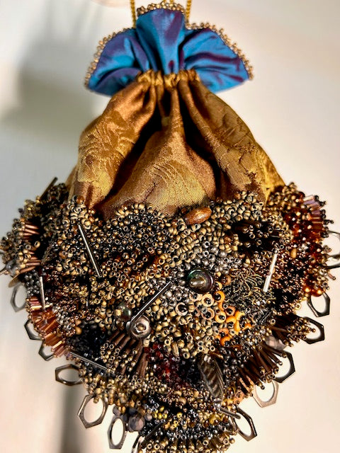 Materials: bronze damask fabric, blue silk lining, vintage glass seed beads, metal accents, gold hand dyed cording.
