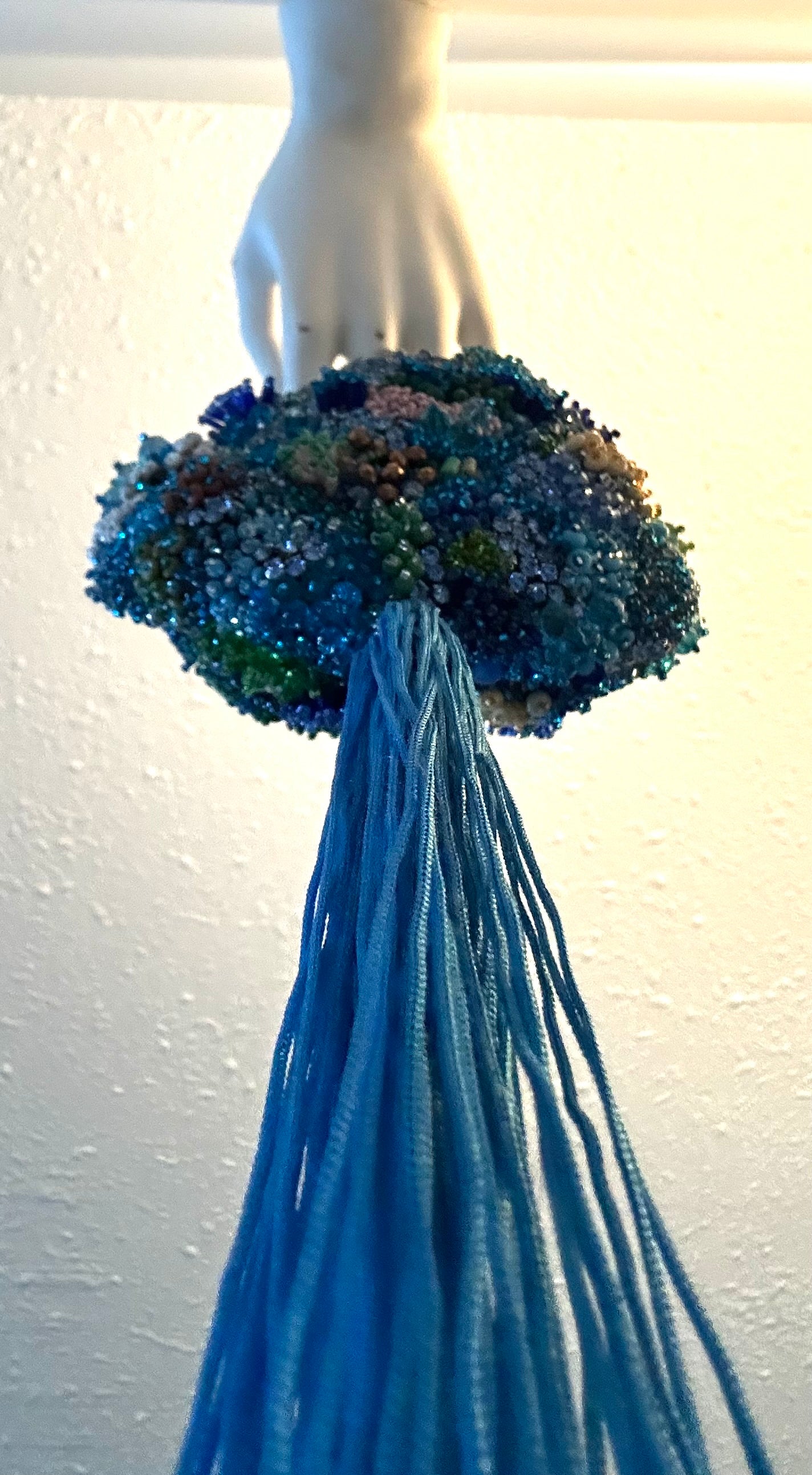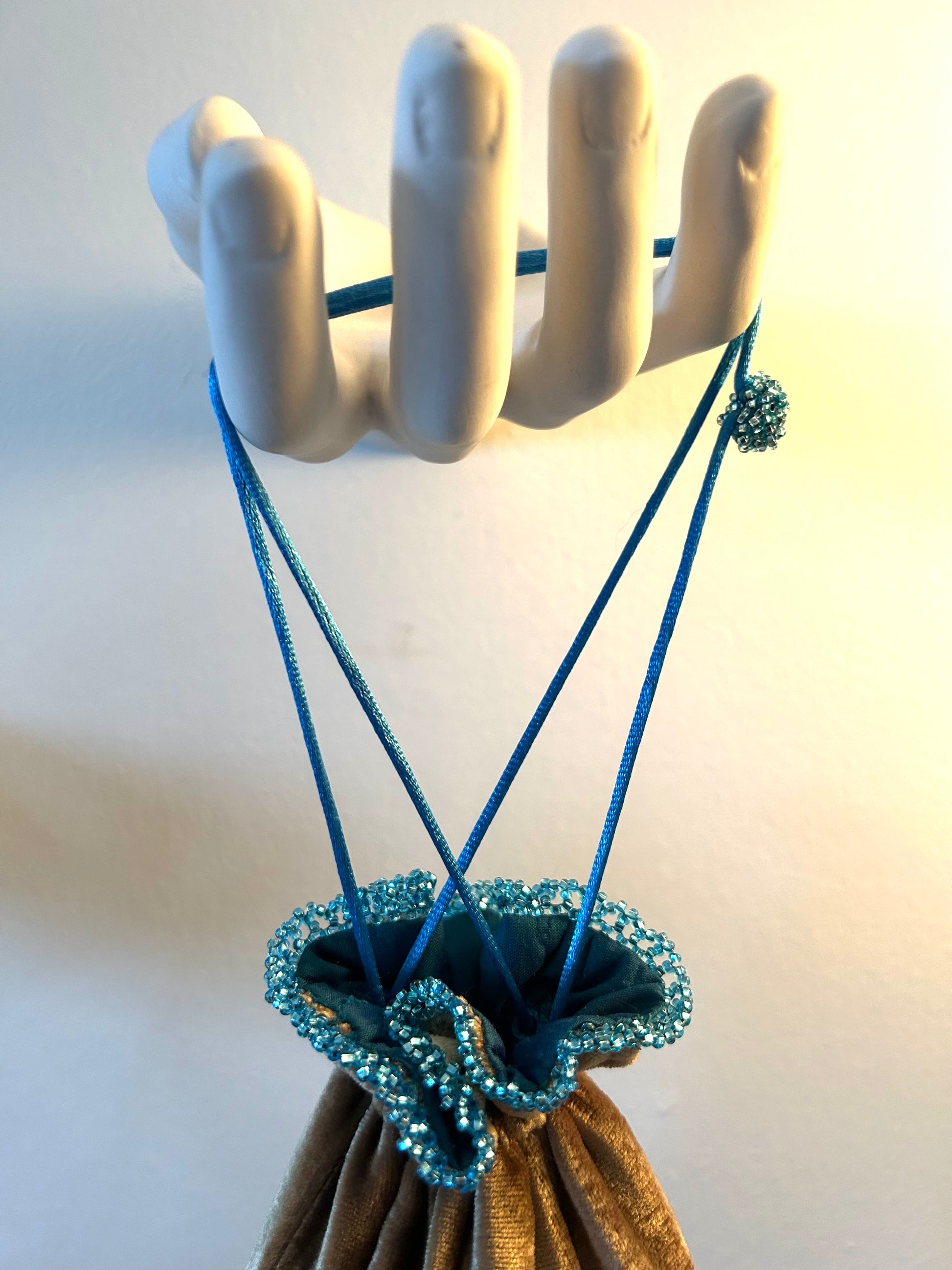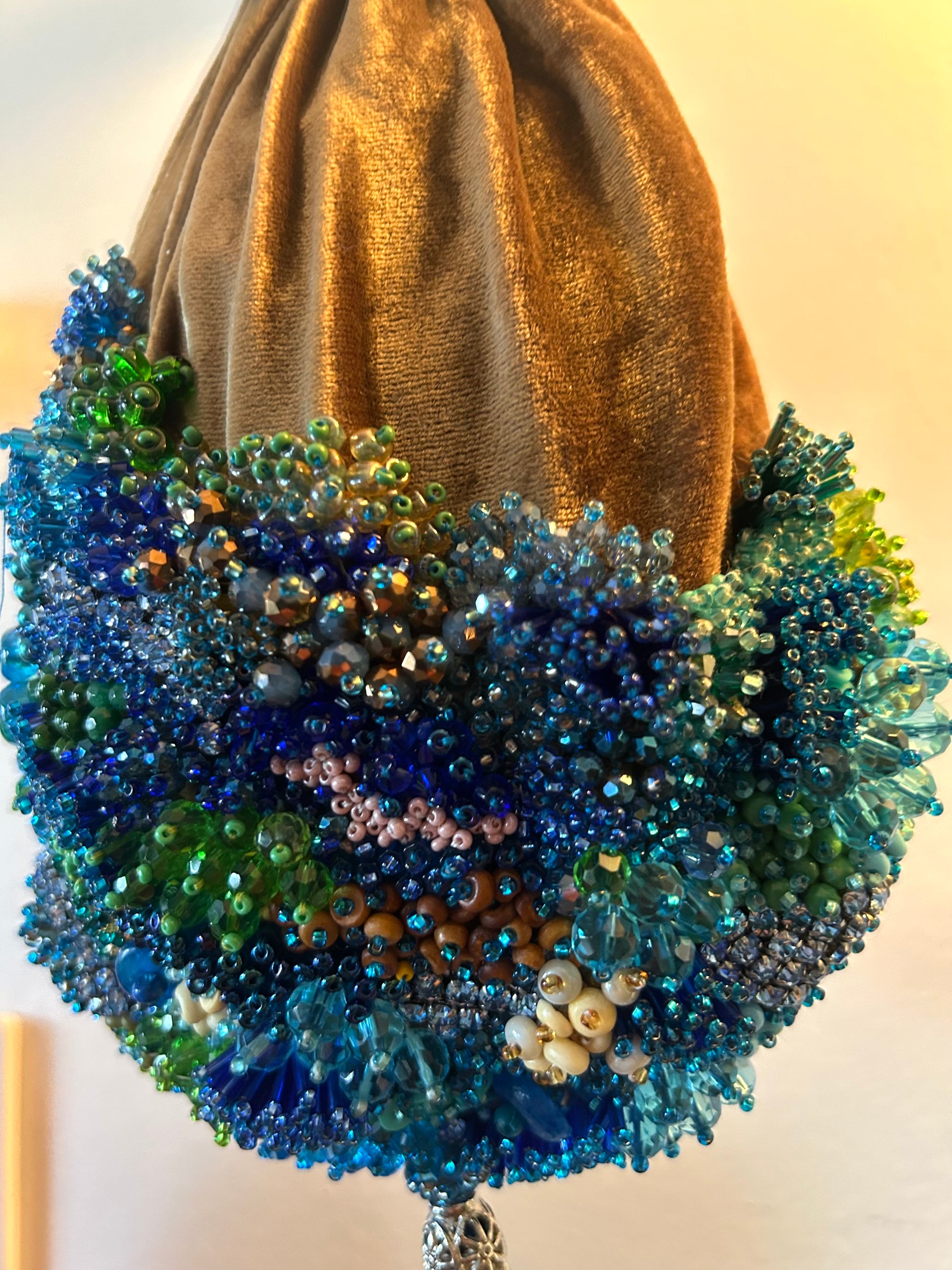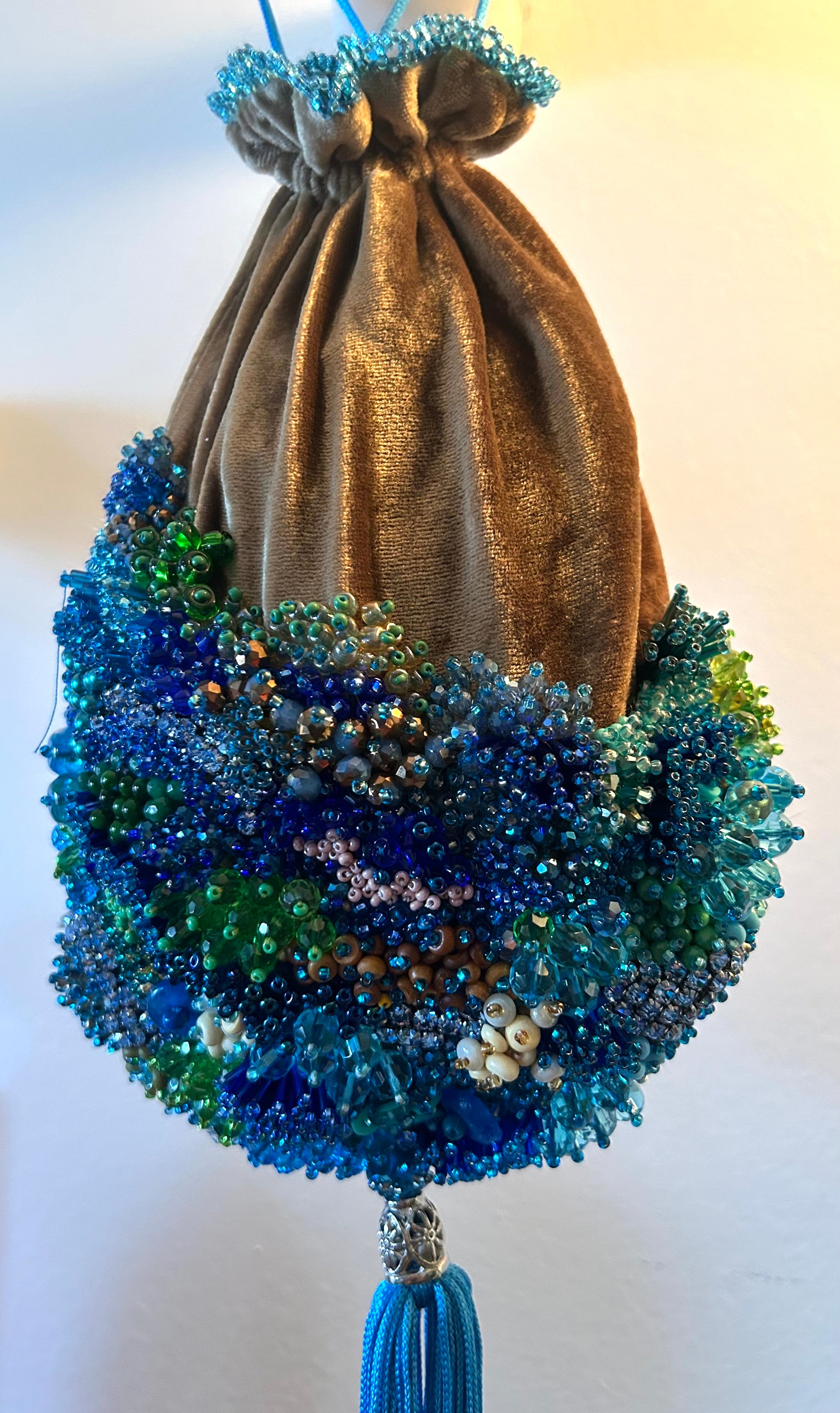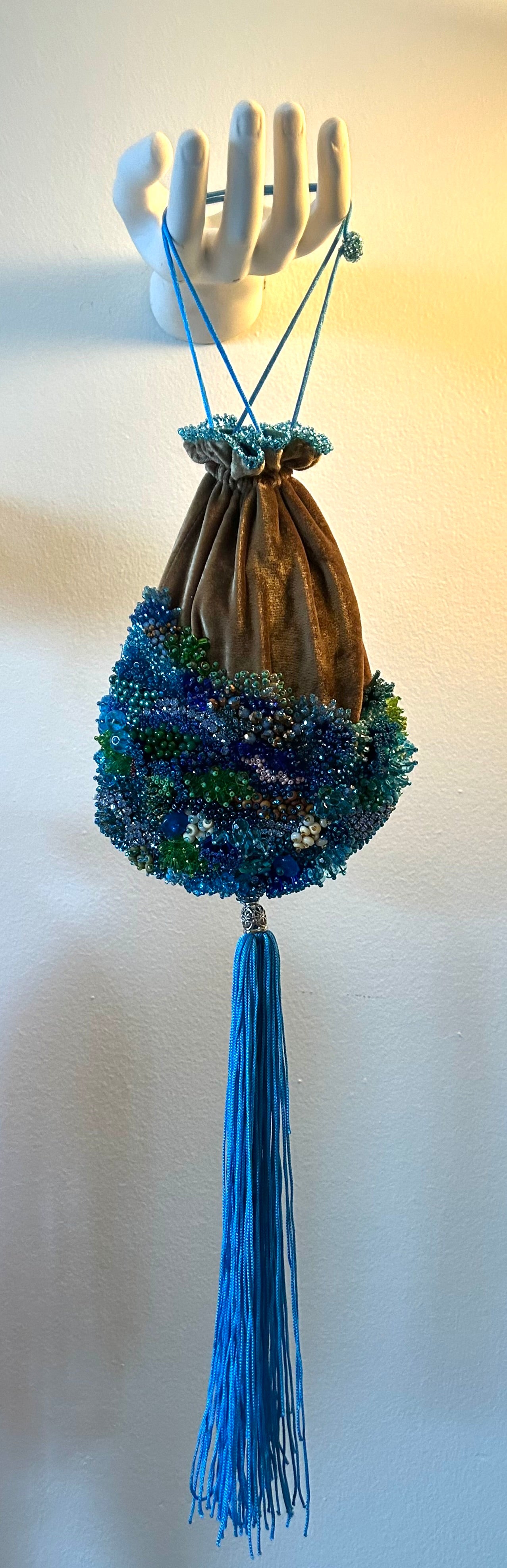 Bold, sun-warmed, and endlessly textured, I Dream of Africa is a reticule that evokes the continent’s rich landscapes and vibrant spirit. This piece is fashioned from earthy gold velvet, its gathered form a nod to ancient vessels and ceremonial pouches. A dazzling crescent of beadwork sweeps across the lower half—an exuberant mosaic of cerulean, sapphire, moss, and sand tones, recalling coral reefs, fertile deltas, and sunlit savannahs. Each bead is hand-placed to form a tactile, living terrain of color and culture. The vivid turquoise tassel cascades like a waterfall, grounding the piece in motion and life. With its striking silhouette and soulful detailing, I Dream of Africa carries the weight of memory, reverence, and imagination.z